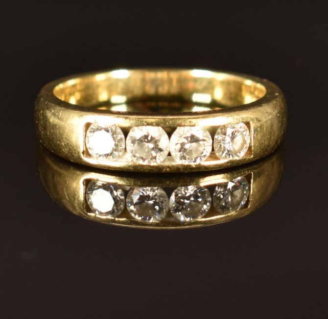 An 18ct gold ring set with four round cut diamonds, size M, 4.9g