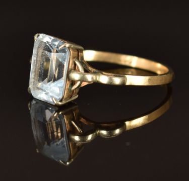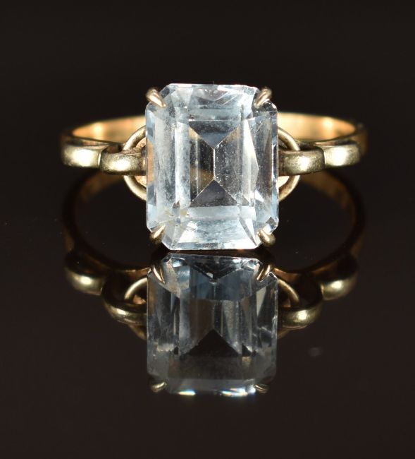 A 9ct gold ring set with emerald cut blue topaz, size O/P, 2.4g