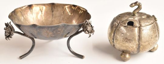 Chinese silver pedestal bowl formed as a lilly pad or similar, raised on three flowers, diameter 8cm together with a Chinese silver mustard formed as a gourd, with character marks and maker's mark NM or WN, weight of both items 89g
