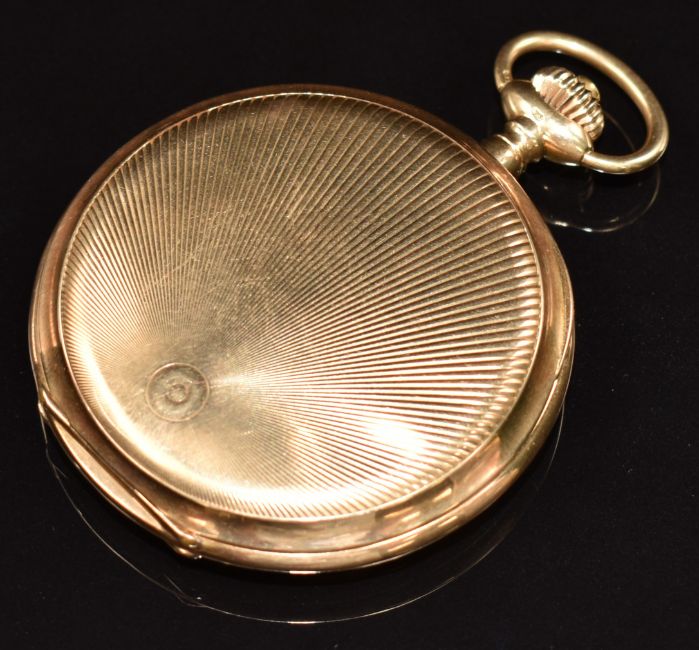 Omega Grand Prix 14ct gold Art Deco style keyless winding full hunter pocket watch with inset subsidiary seconds dial, gold hands, black Arabic numerals, white enamel dial and signed movement, case diameter 51mm, serial number 4018347, 76g.