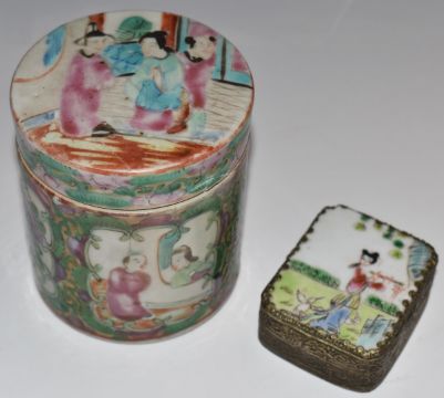 Canton Chinese 19th/20thC covered canister / caddy and a make up box with mirror, H9, diameter 8cm