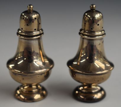 George V pair of hallmarked silver novelty miniature peppers, London 1910, maker Charles Edwin Turner, height 5cm, weight 15g all in