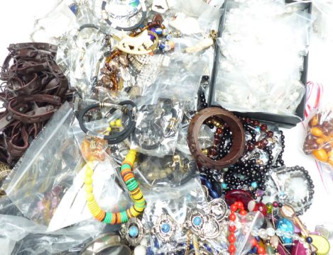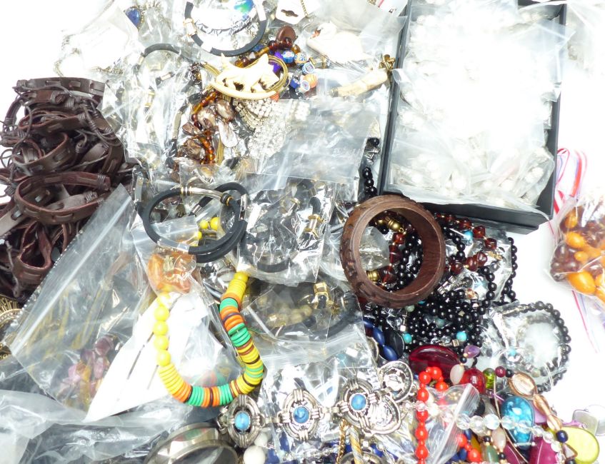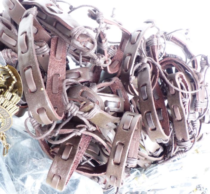 A quantity of gentlemen's bracelets ever changing love stones, leather bracelets, 600 plated necklaces, jasper and onyx bracelets, crystal earrings and necklaces, etc