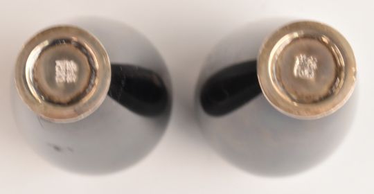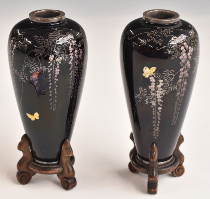 A pair of cloisonné vases on stands, with white metal mounts and four character marks to base, H9.5cm