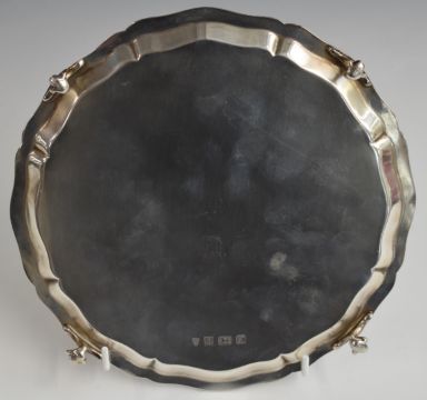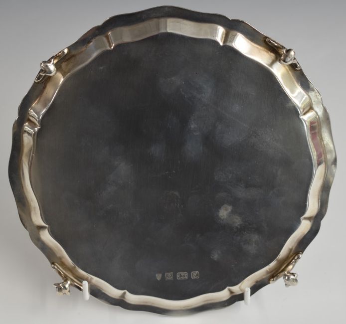 Elizabeth II hallmarked silver salver or card tray, raised on four ball and claw feet, Birmingham 1979, maker J B Chatterley & Sons Ltd, diameter 20cm, weight 273g