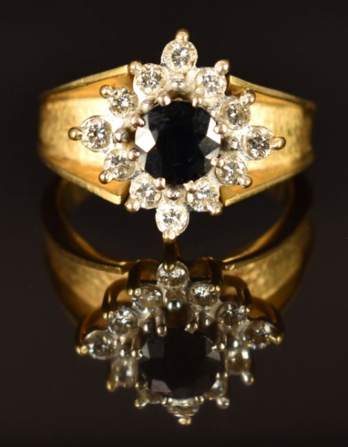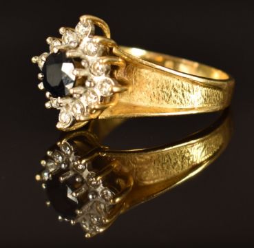An 18ct gold ring set with a round cut sapphire and diamonds, size P, 9g
