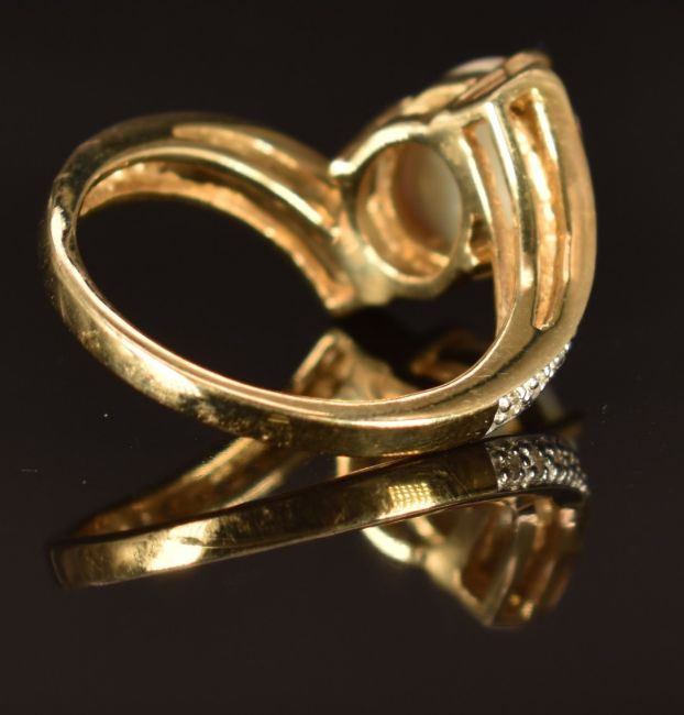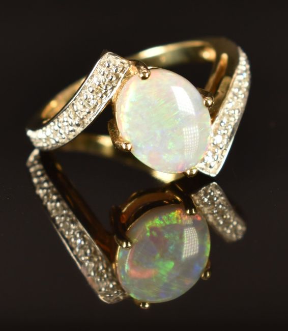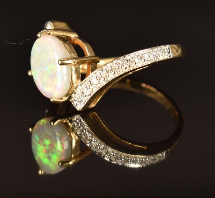 A 9ct gold ring set with an opal and diamonds, size N, 4.2g