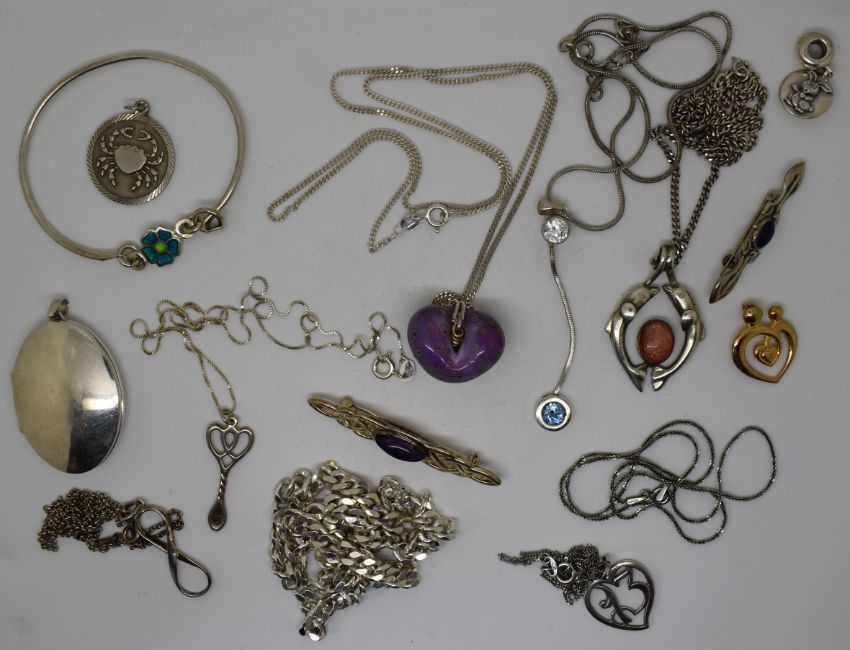 A collection of silver jewellery including brooches, locket, pendants, chains, curb link necklace, etc