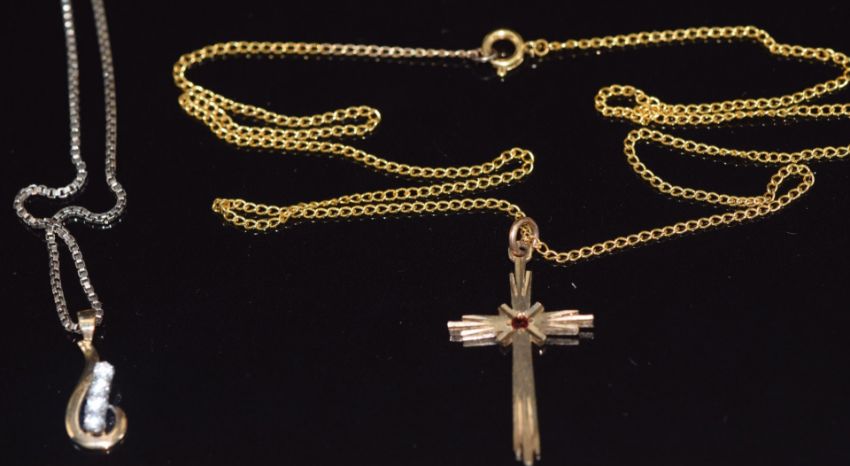 Two 9ct gold chains and two 9ct gold pendants, 10.9g