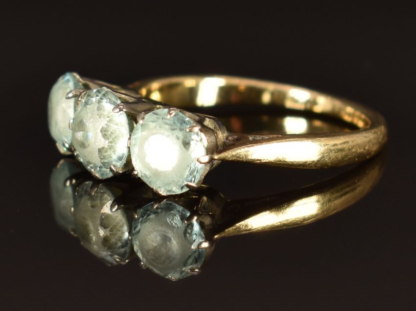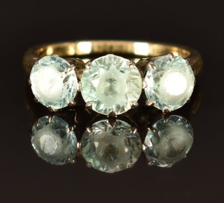 A 9ct gold ring set with three round cut zircon, size L, 3.7g