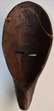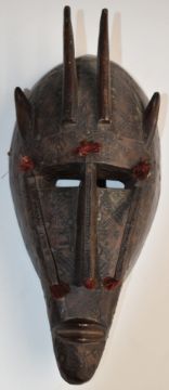 African tribal carved and horned Marka mask with beaten metal decoration, H34cm. Provenance:- part of the Roger Warner collection, brought back to England pre1913