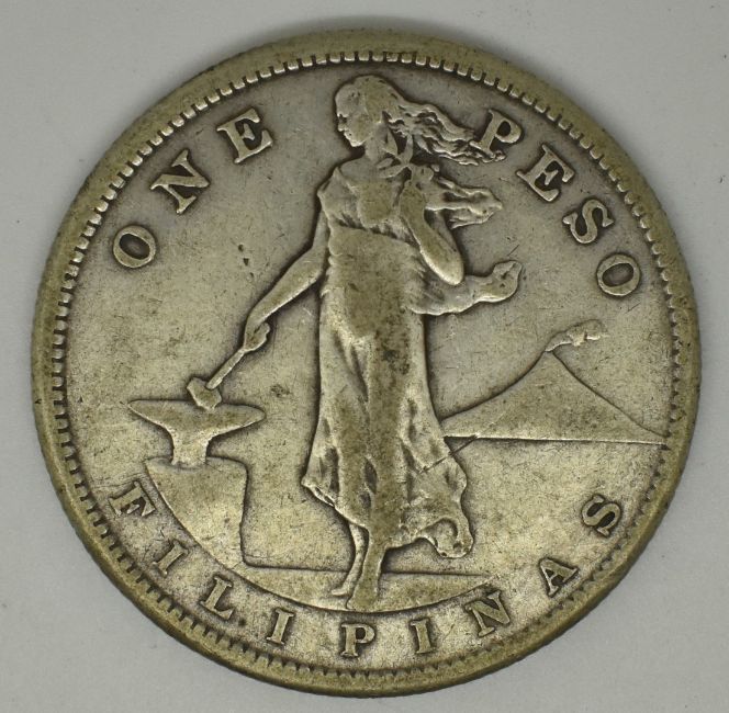 USA silver one peso Filipinas 1907 (under US sovereignty), obverse lady in flowing dress standing with hammer and anvil, unicorns to right behind, reverse eagle over Stars and Stripes shield