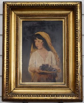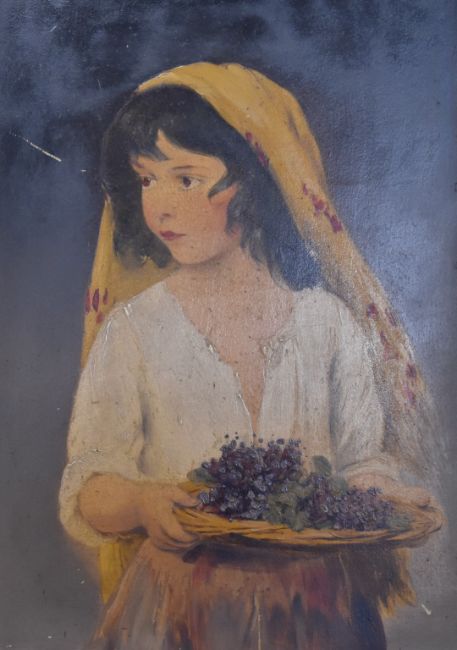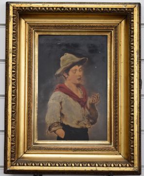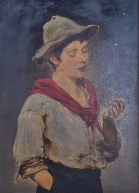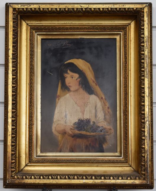 Eugene Von Blaas (1843-1932) pair of 19th/20thC oil on board portraits of a boy smoking and a girl with basket of fruit probably 'Piccolo' and 'I am a Child', 30 x 19.5cm, in period gilt frames