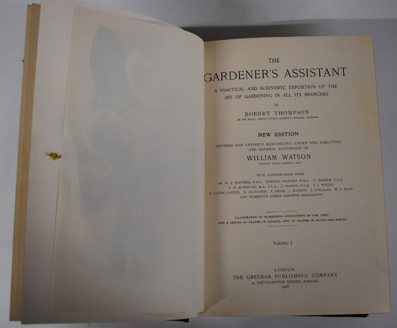 Hutchinson's Popular Botany The Living Plant from Seed to Fruit by A.E. Knight & Edward Step with approximately 1000 beautiful illustrations including numerous coloured plates (1912) first edition in 18 Parts as issued in original wrappers, The Gardener's Assistant A Practical & Scientific Exposition of the Art of Gardening in all its Branches by Robert Thompson illustrated in colour and black & white published Gresham 1906 in 2 volumes new edition in leather backed cloth with gilt lettered leather labels together with a volume of English Botany with hand-coloured plates in half-leather