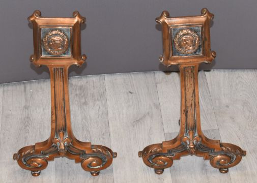 A pair of continental bronze fire dogs with portrait and fleur de lys decoration, H39cm