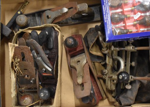 Collection of woodworking planes including Stanley Trade 45, no 4 1/2, no 5, Handyman, Marples M 4 1/2, wooden scribe, box of woodcarving tools etc