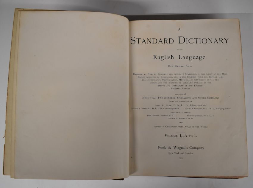 [Binding] A Standard Dictionary of the English Language upon Original Plans prepared by more than 200 specialists and other Scholars under the supervision of Isaac K Funk, also Abridged Cyclopedia with Atlas of the World published Funk & Wagnalls 1902 in 2 volumes illustrated with numerous full-page colour plates, engravings and portraits etc handsomely bound in full morocco with gilt and blind stamped decorated borders, raised bands with gilt titles & decoration to spines (2)