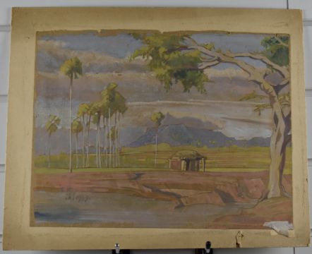 Theodore Howard Somervell, OBE, FRCS (British 1890-1975) watercolour laid on card of a building on a riverbank with mountains in the distance, signed and dated 1939 lower left, 28 x 36cm