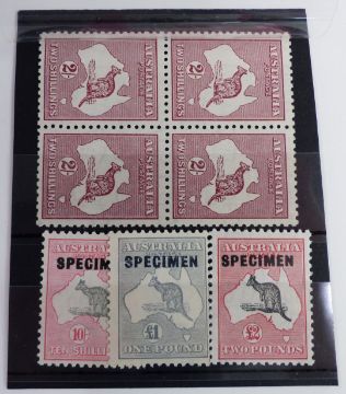 Australia 1931-36, 10s, £1 and £2 mint specimen set of three with 2s brown mint block x 4