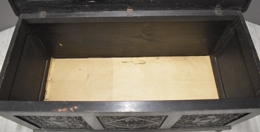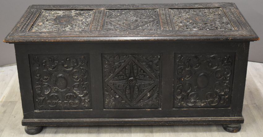 19thC carved oak trunk or coffer raised on bun feet, W132 x D61 x H60cm