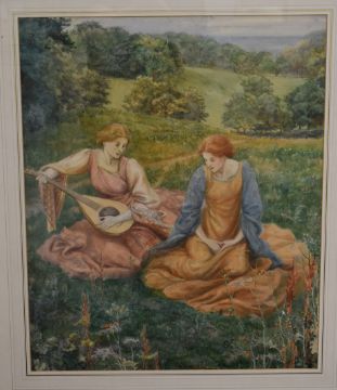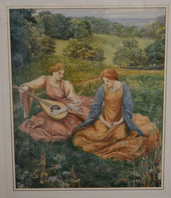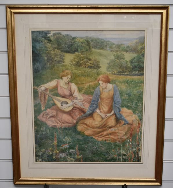 Walford Graham Robertson (1867-1948) watercolour of two young maidens in the Pre-Raphaelite style sitting together in a meadow, one playing a lute, with trees and fields behind. Monogramed and dated RG 1894 lower right, 59 x 49cm, in gilt frame