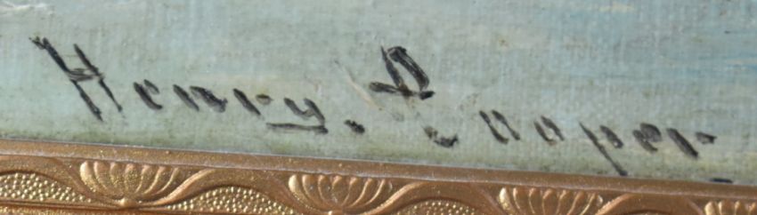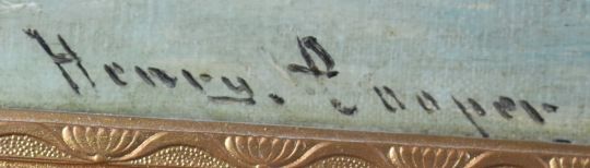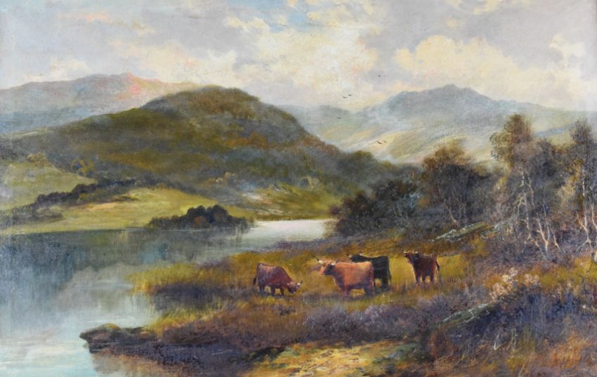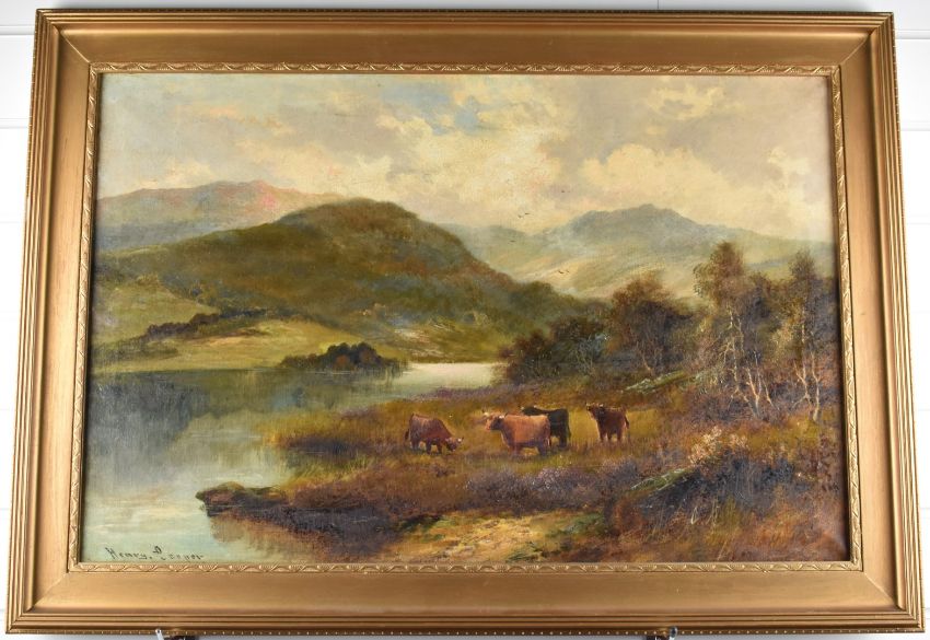 Henry Cooper (British, late 19th/20thC) oil on canvas Highland cattle beside a loch or river with mountains, 50 x 75cm, with old gallery receipt