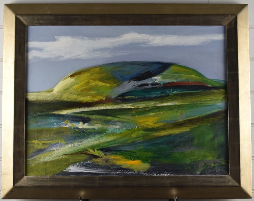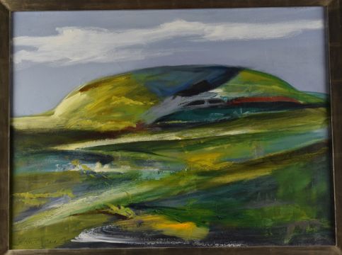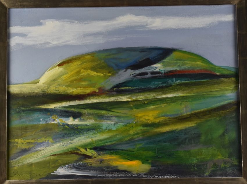 John Cleal (Welsh 1929-2007) abstract oil 'Blue-green Landscape', signed lower left, 44 x 60cm, in modern frame, titled verso