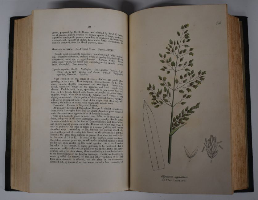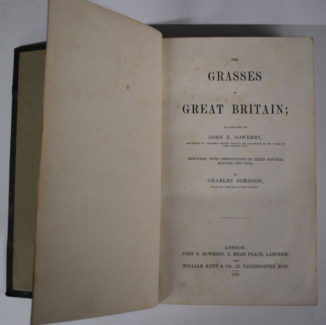 The Grasses of Great Britain Illustrated by John E. Sowerby described with observations on their natural history and uses by Charles Johnson, published Sowerby & Kent 1861 first edition with 144 hand-coloured plates, bound in half leather with raised bands and gilt lettered leather label