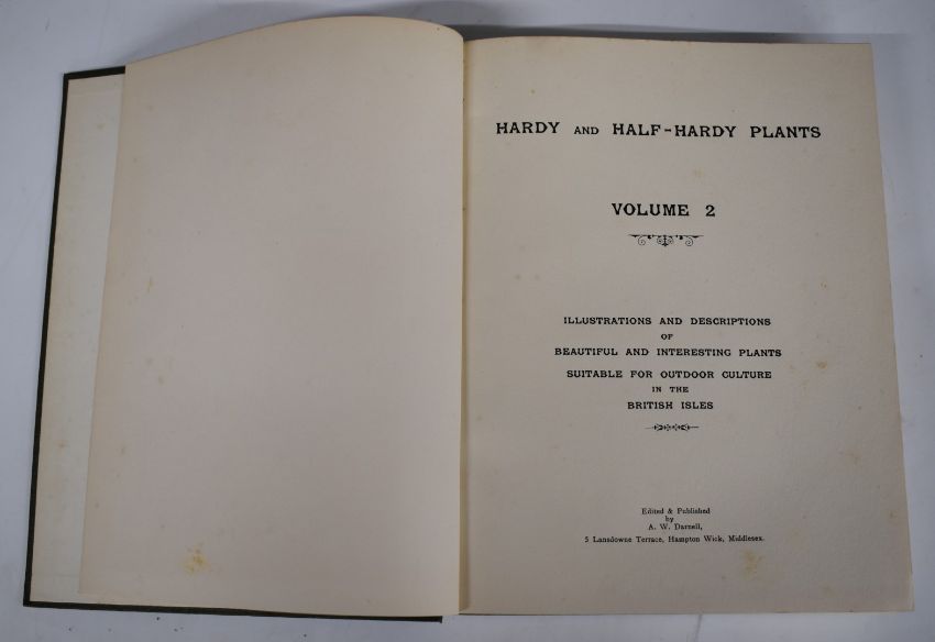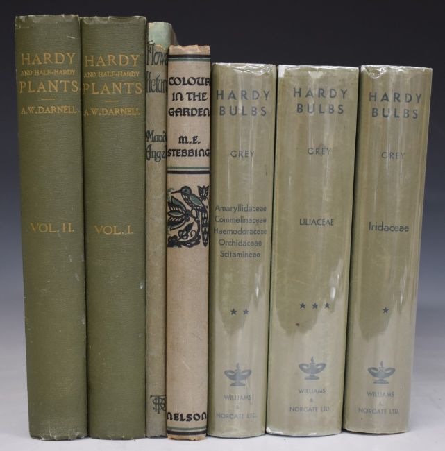 Hardy Bulbs Including Half-Hardy Bulbs & Tuberous & Fibrous-Rooted Plants by Charles Hervey Gray illustrated by Cecily Grey, published Williams & Norgate 1937 first edition in 3 volumes with colour plates and other drawings, in gilt cloth in original illustrated dust-wrappers, Hardy and Half-Hardy Plants with illustrations and descriptions edited & published A.W. Darnell (1930) in 2 volumes with numerous colour plates bound in gilt cloth, Colour in the Garden by Stebbing with 300 colour drawings by Miss M. Walters Anson (c.1940) printed cloth and Flower Pictures by Maude Angell (c.1915) boards with colour onlay (7)