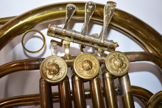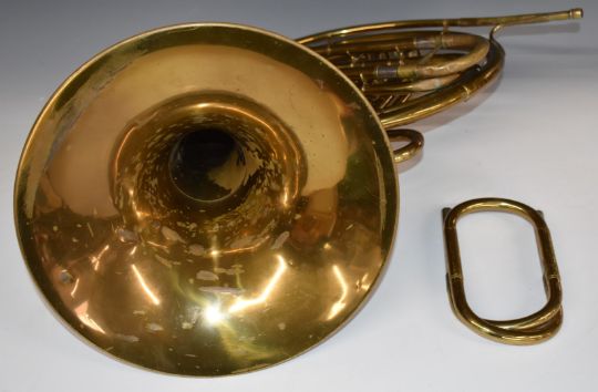 A travelling French horn, the main brass body and slides disconnecting from the bell to fit into a fitted case, formerly the property of Theodore Howard Somervell