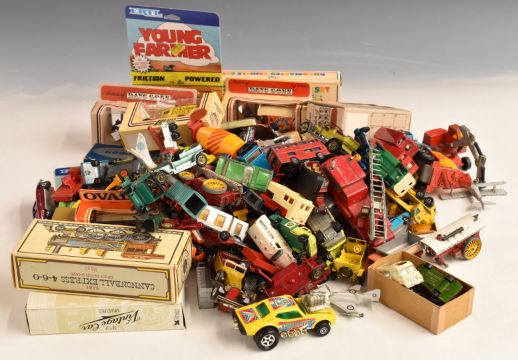 Over 100 mainly Matchbox diecast model vehicles including Merryweather Fire Engine, Foden Breakdown Tractor and Hoverinham Tipper, some in original boxes.