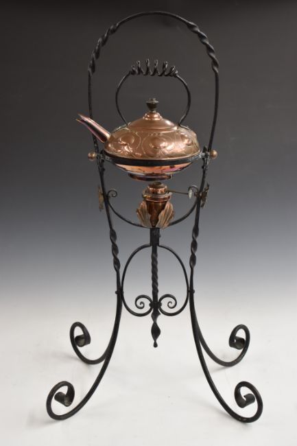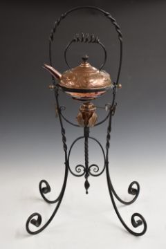 In the manner of W.A.S Benson copper and wrought iron spirit kettle on stand, H70cm