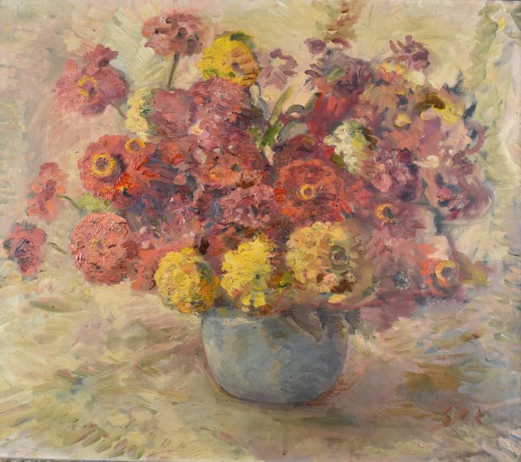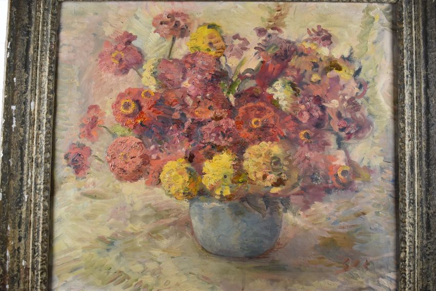 Oil on canvas impressionist still life of flowers, indistinctly signed lower left possibly Philip Kaufanny, 59 x 69cm, in distressed frame