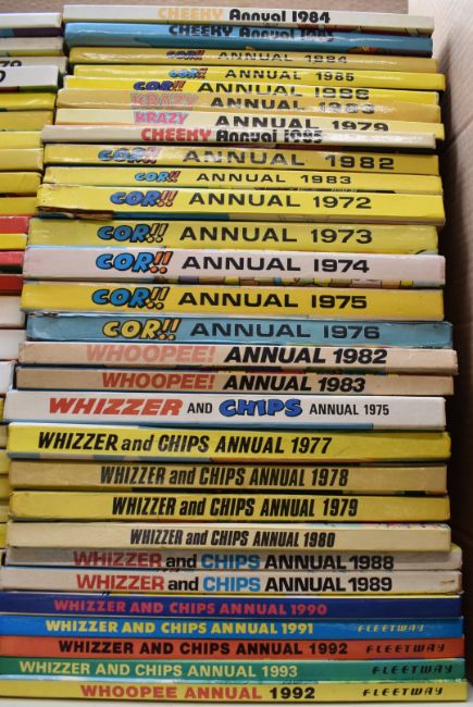 Fifty-seven children's humour annuals including Whoopee, Whizzer & Chips, Cheeky etc.