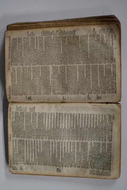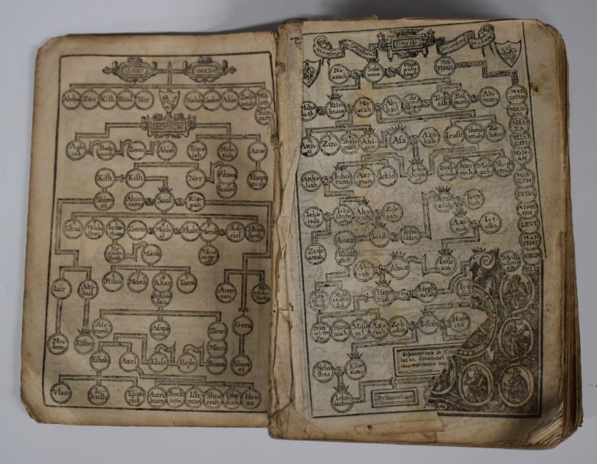 [King James Bible] The Holy Bible containing the Old Testament and the New, newly translated out of the original Tongues and with the former translation diligently compared and revised; by His Majesties speciall commanderment printed by Robert Barker and John Bill 1631, the first page with engraved illustration of Adam and Eve followed by 27 sides printed with genealogies, engraved title page, The New Testament with engraved title page (dated 1631), with an engraved title page and few pages for The Whole Book of Psalms (dated 1631), lacks binding, no title to Genealogies and believe some tables lacking with one damaged, no map present, first section loose and ink names at end of New Testament (1)