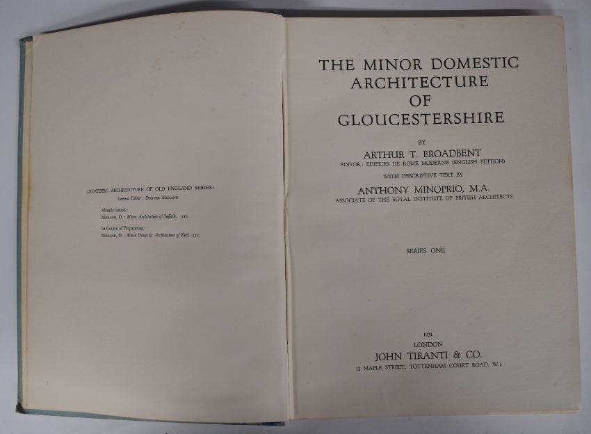 [Local Interest] Illustrations of the Remains of Roman Art in Cirencester The Site of Ancient Corinium by Professor Buckman & C.H. Newmarch 1850 with coloured plates in gilt cloth (re-backed), Old Cottages Farm-Houses and Other Stone Buildings in The Cotswold District illustrated with 100 collotype plates by Galsworthy Davie and Introduction by Guy Dawber Architect 1905 in decorated cloth, Domestic Architecture of Gloucestershire by Broadbent & Minoprio 1931, Picturesque Gloucestershire 1928 in half leather, Excavations of Roman Baths at Bath illustrated, History & Antiquities of Bath Abbey Church by Britton 1887 in gilt cloth and others (17)
