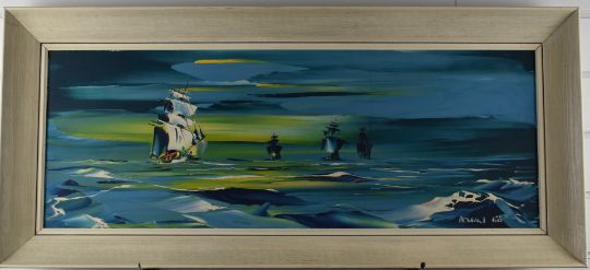 George Richard Deakins (1911-1982) two oil on board maritime studies, both signed, one dated 68, larger 29 x 80cm, both in white painted wooden frames
