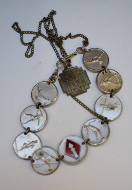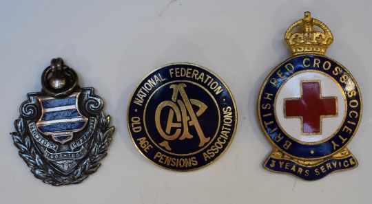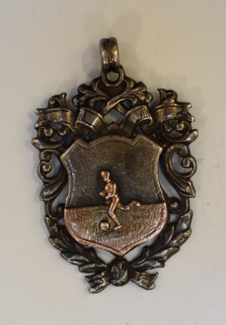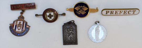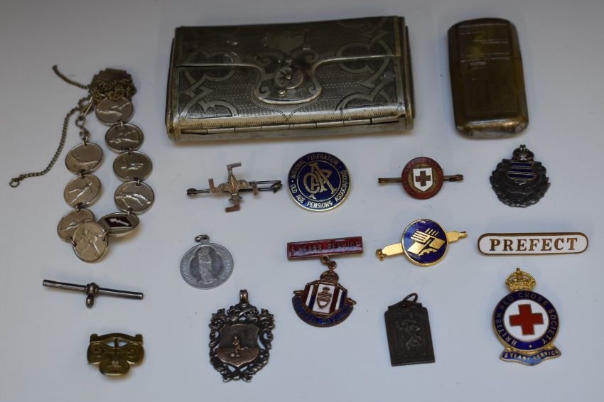 Small collection of badges including an early swastika, Scouts badge stamped silver to reverse, Westbury hallmarked silver example and a hallmarked silver football example dated 1905, cigarette case and a vintage lighter