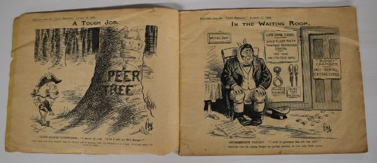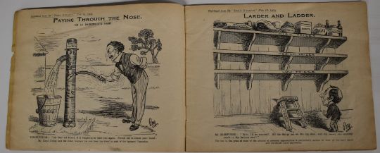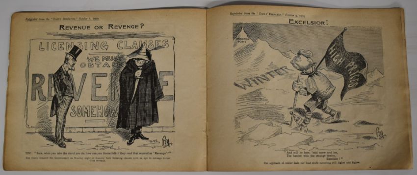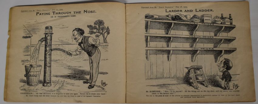 POY (Percy Hutton) pen and ink original political cartoon titled ' Lenin and Trotsky Russian Stores' with WW1 era leaders including Kaiser Wilhelm II, Enver Pasha and Baby Carl queuing at the store. Signed POY, c1917/1918, framed and mounted, 37 x 29cm, together with 1909 edition of Fifty Budget Cartoons from the Daily Despatch by POY