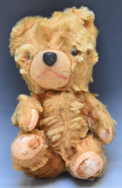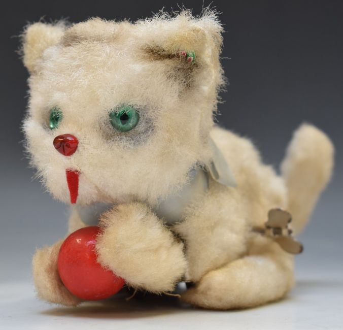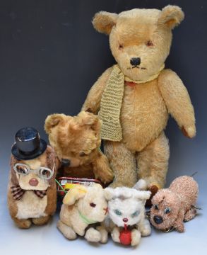 Six vintage Teddy bears including a blonde mohair example with clockwork musical box playing Little Donkey, remote controlled dog with top hat, clockwork rabbit and cat etc, largest 42cm tall.