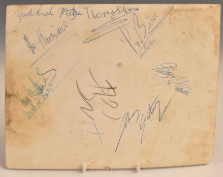 Rory Storm & The Hurricanes Butlin's photograph signed to reverse by Rory Storm (with dedication 'Good Luck Mike'), Ringo Starr, Lou Walters, Ty O'Brien and Johnny Guitar. 'The Hurricanes' appears to have been added by Walters, O'Brien, Walters and Starr have also added their role in the band. The autographs were obtained by the vendor's father at Butlin's Pwllheli holiday camp, Ringo Starr was a member of the Hurricanes prior to joining the Beatles in 1962