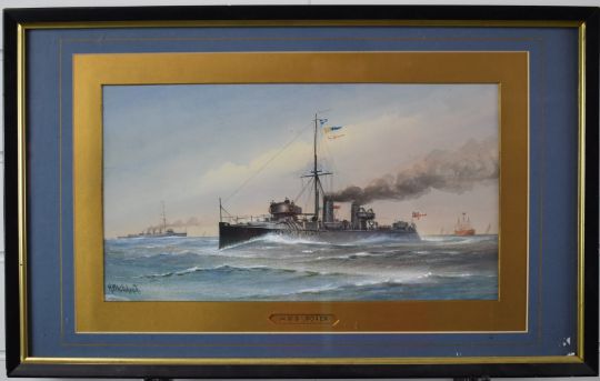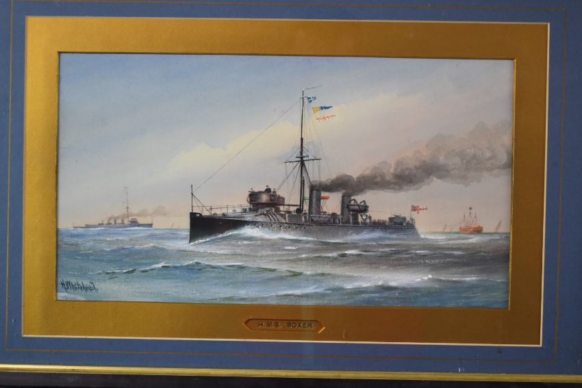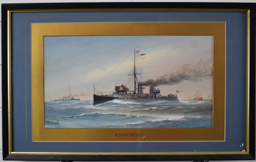Harold Whitehead late 19th or early 20thC maritime watercolour 'H.M.S. Boxer', signed lower left, 20.5 x 38cm, in gilt and ebonised frame