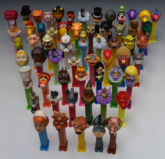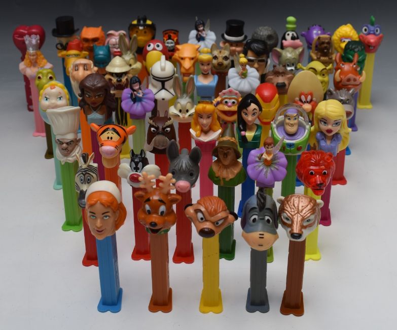 A collection of over 350 Pez dispensers from the 1970's-2000's including Disney, Star Wars, The Simpsons, Warner Bros with some early non-footed versions.