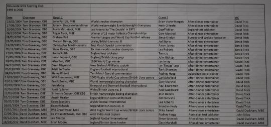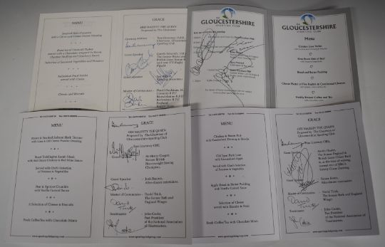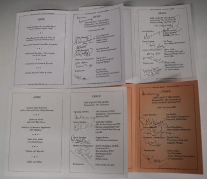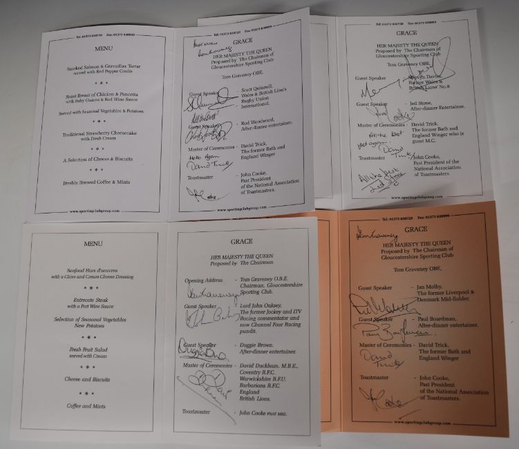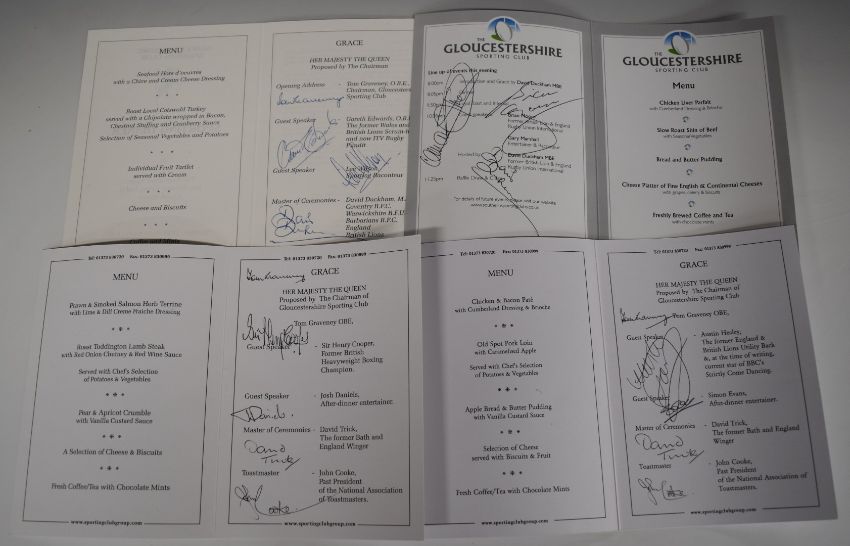 Sixty five Gloucester Sporting Club programmes with autographs of guest speaker including sports stars from cricket, rugby, football, boxing, snooker, horse racing etc, many notable names from 1966 World Cup squad, Manchester United etc comprising Paul Ackford, Fred Trueman, Sir Richard Hadlee, Jimmy Greaves MBE, Sir Henry Cooper OBE KSG, Willie John McBride, Bill Beaumont OBE, David Lloyd (Bumble), Gareth Edwards OBE, Nobby Stiles OBE, Geoff Boycott OBE, John Conteh, Tom Graveney OBE, John Francome, Gordon Brown, Alan Ball MBE, Bill McLaren, Chris Cowdrey, Gareth Chilcott, Jim Watt MBE, Tony Lewis, Lord John Oaksey, Gordon Banks OBE, Cliff Morgan OBE, Martin Bayfield, Sir Bobby Charlton CBE, Dennis Taylor, Emlyn Hughes OBE, Alex Hay, Jack Charlton OBE, Fergus Slattery, Graham Gooch OBE, Dougie Donnelly, Will Carling OBE, Dermot Reeve OBE, Brian Moore, Dickie Bird OBE, John Parrott MBE, John H. Stracey, Alan Minter, Frank McLintock MBE, Roger Black MBE, Graham Poll, Mervyn Davies OBE, Christopher Martin-Jenkins, Steve Davies OBE, Robin Smith, Jason Leonard OBE, Sean Fitzpatrick, Matt Le Tissier, Henry Blofeld, Frank Bruno MBE, Jan Molby, Scott Quinnell, Austin Healey, Dean Saunders, Dean Richards, Will Greenwood MBE, Sir Vivian Richards KNH OBE, Lee Sharpe, Brian Moore, Denis Law, Peter Brown, Billy Thompson MBE, Geoff Miller, Mike Kelly, Stan Taylor, Kevin Connelly, Barry Williams, Lee Wilson, Keith O'Keefe, Jackie Blanchflower, Bob 'The Cat' Bevan, Steve Kindon, Paul Fletcher, Arnie Martin, John Sterling, Dr. Kevin Jones, Duggie Brown, Mike Farrell, Harry Scott, Ian Irvine, Sean Styles, Rod Woodward, David Vaughan, Willie Miller, Billy Bean, Sid Dennis, Mick Miller, Roger DeCourcey, Brendan Healy, Ian Robertson, George McNeil, John Martin, Terry Thomas, Brian Voyle-Morgan, Gary Marshall, Jed Stone, Aaron James, Lea Roberts, Tony Jo, John Bishop, Ian Irving, Ian 'Sludge' Lees, Tank Sherman, Rodney Hogg, Carl Schofield, Paul Boardman, Rod Woodward, Josh Daniels, Simon Evans, Rodney Hogg and Steve Womack, together with a 1995 Wales v England Gala Dinner menu with multiple autographs including Ian Robertson, Derek Quinnell and Bill Beaumont