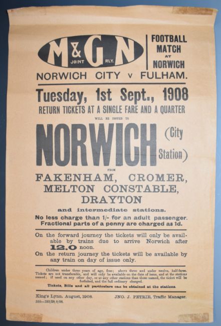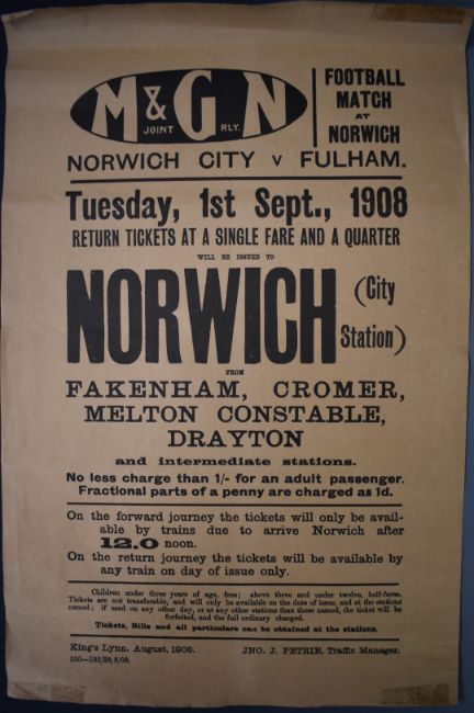 1908 Norwich City v Fulham M & G N railway football poster, 38 x 25cm