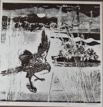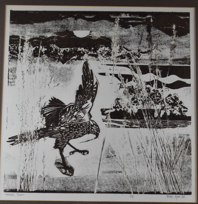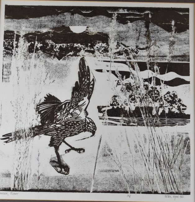 Peter Lyon signed limited edition (4/8) print Harrier Flight, bird in landscape, 44 x 44cm