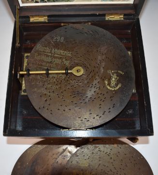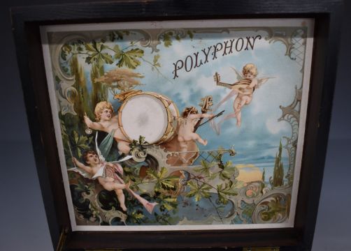 A mahogany cased table top Polyphon with 8 inch discs, 26 x 24 x 15cm