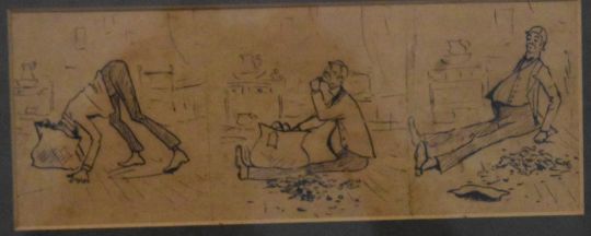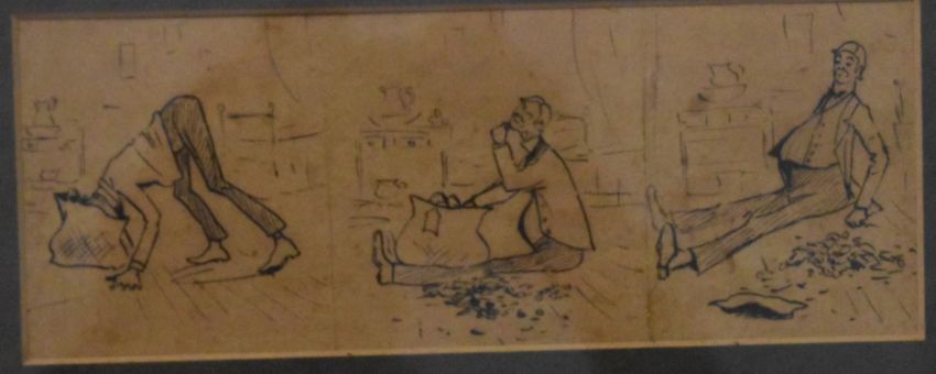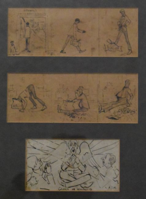 Alfred Munnings framed set of three sketches, the top two forming cartoon type strips, the lower example being on an envelope titled 'Gloria in Walnutis', monogrammed AIM lower right, overall size 38 x 30.5cm. Munnings was the cousin of the vendor's grandfather