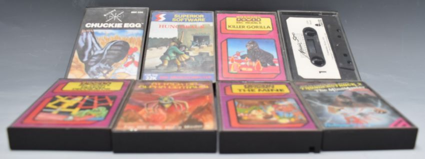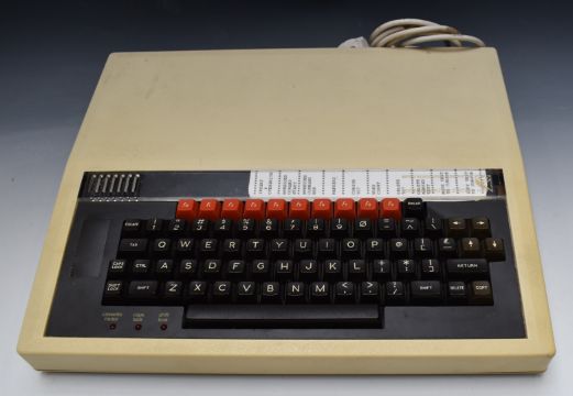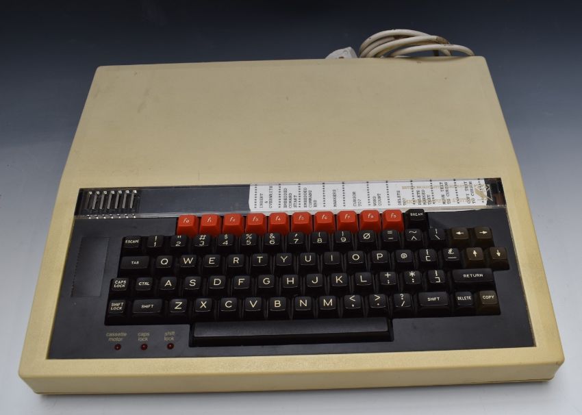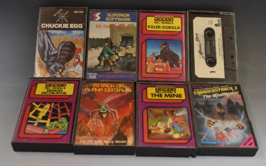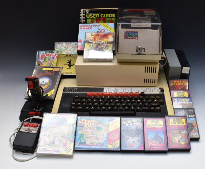 A vintage BBC computer including disk drive, mouse and a selection of games.