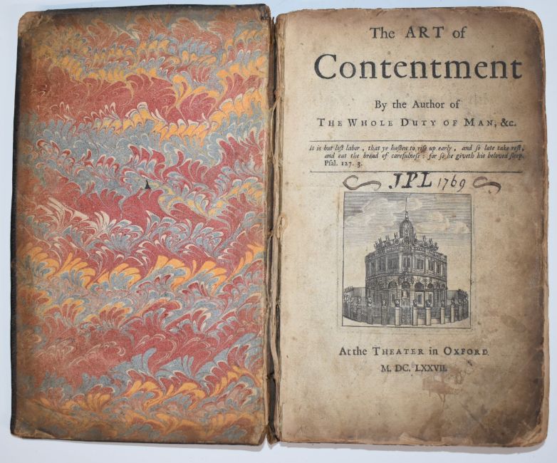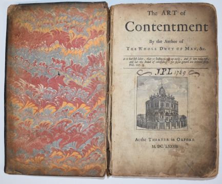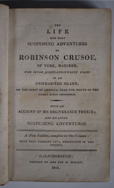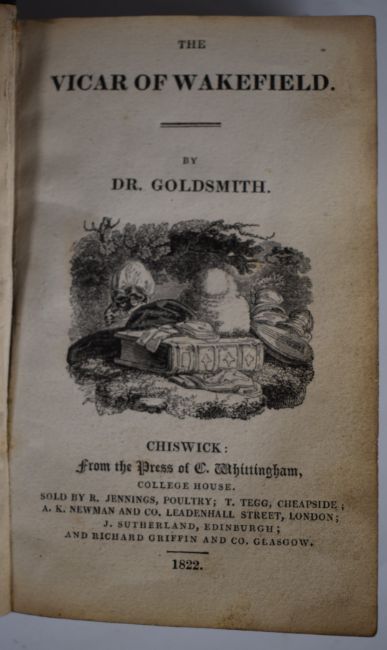 [Defoe] The Life and most Surprising Adventures of Robinson Crusoe of York, Mariner who lived eight-and-twenty years in an Uninhabited Island, with an account of his deliverance printed by H. Mozley 1814 with engraved title, frontispiece and four engraved plates in leather backed boards, Vicar of Wakefield by Dr. Goldsmith with text engravings printed by C. Whittingham 1822 plus an Incomplete copy of The Art of Contentment by the author of The Whole Duty of Man &c (Richard Allestree) At the Theatre in Oxford 1677 bound in leather (3)